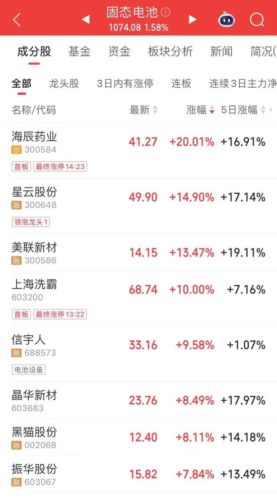 今天午后,固态电池概念持续走强,上海洗霸涨停,创历史新高。