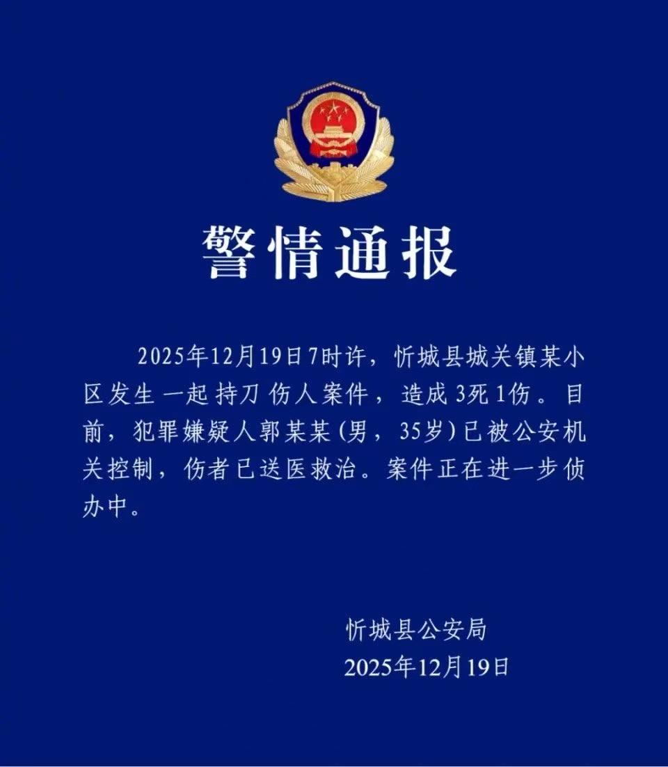 中国网12月19日讯 广西忻城县公安局19日发布警情通报:2025年12月19日7时许,忻城县城关镇某小区发生一起持刀伤人案件,造成3死1伤。