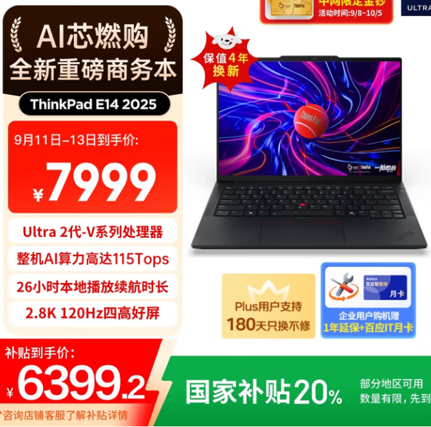 提到高续航,绕不开的一个系列就是ThinkPad E14。第七代ThinkPad E14拥有多个版本,比如商务版、AI版、超能版,每款机型搭载处理器不同、功耗设定不同,因此对于初次选购ThinkPad系列的小伙伴非常不友好——只看线上机型的配置去做区分,很容易被绕晕。而牛叔推荐这款国补价6399元的版本,是ThinkPad E14超长续航版。在众多轻薄本机型中,这款机型重量居中,为1.32kg。虽然只配备了64Wh电池,但官方标称的本地视频播放续航有26小时25分钟。但是需要注意,Thinkpad系列在牛叔看来,一个比较麻烦的问题就是散热格栅太细密、开口也很靠下,一旦散热不流畅,你是休想拥有这样高续航的,因此这款机型如果想要用出它的续航极限,就非常挑工作场景。另外这款机型内部扩展性一般,标配的SSD位为2242长度。